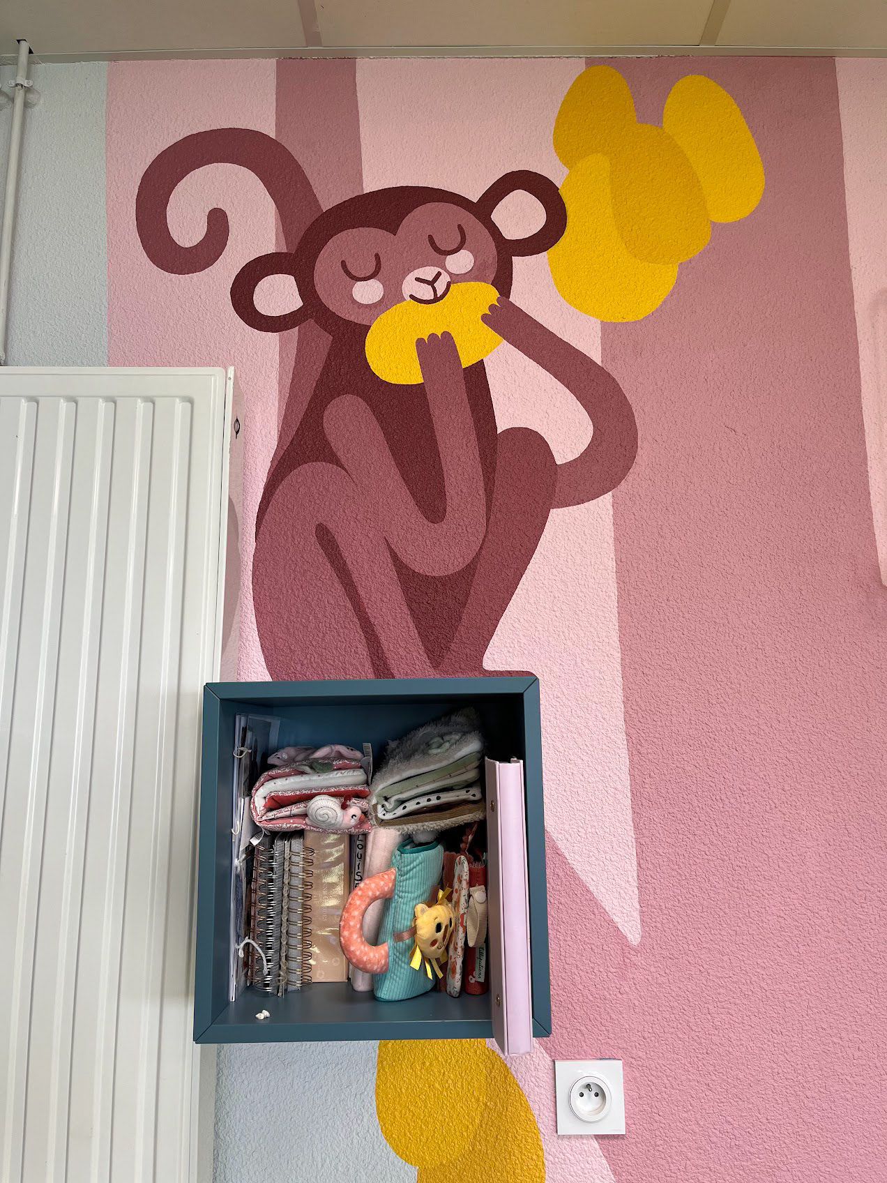 Utilisation des éléments existants (cubes accrochés au mur) comme support pour les petits singes espiègles.